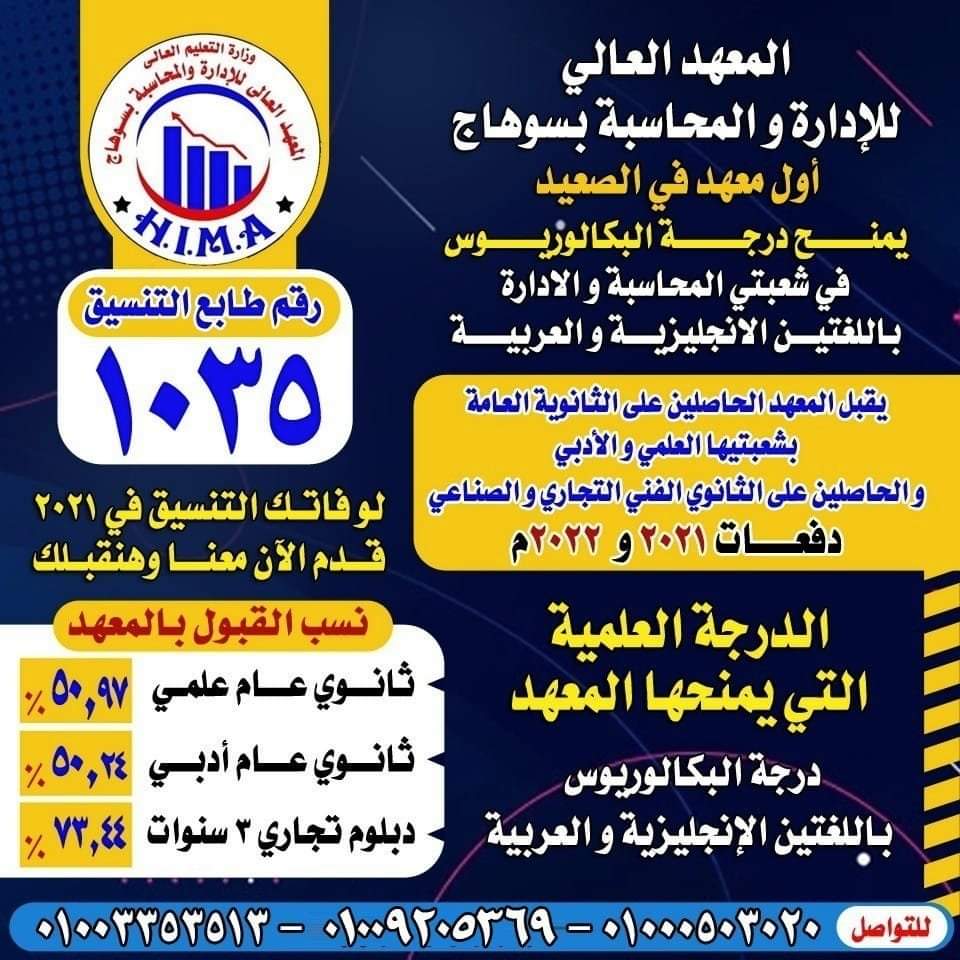 .. لو فاتك تنسيق السنة اللى فاتت أو اتفصلت من معهد أو كلية مكانك عندنا.. المعهد العالى للإدارة والمحاسبة بسوهاج