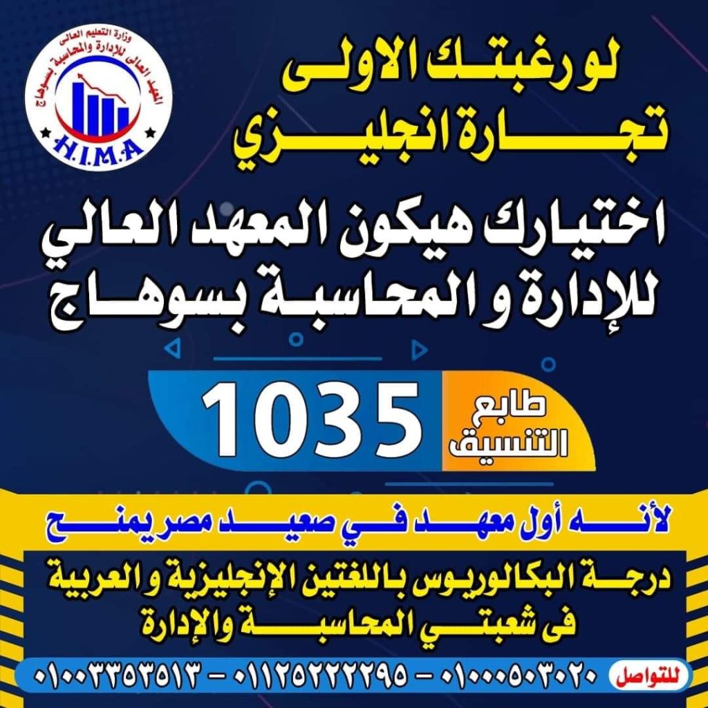 لو رغبتك الاولى تجارة انجليزي اختار المعهد العالي للادارة و المحاسبة اول معهد في الصعيد يمنح درجة البكالوريوس فى شعبتى